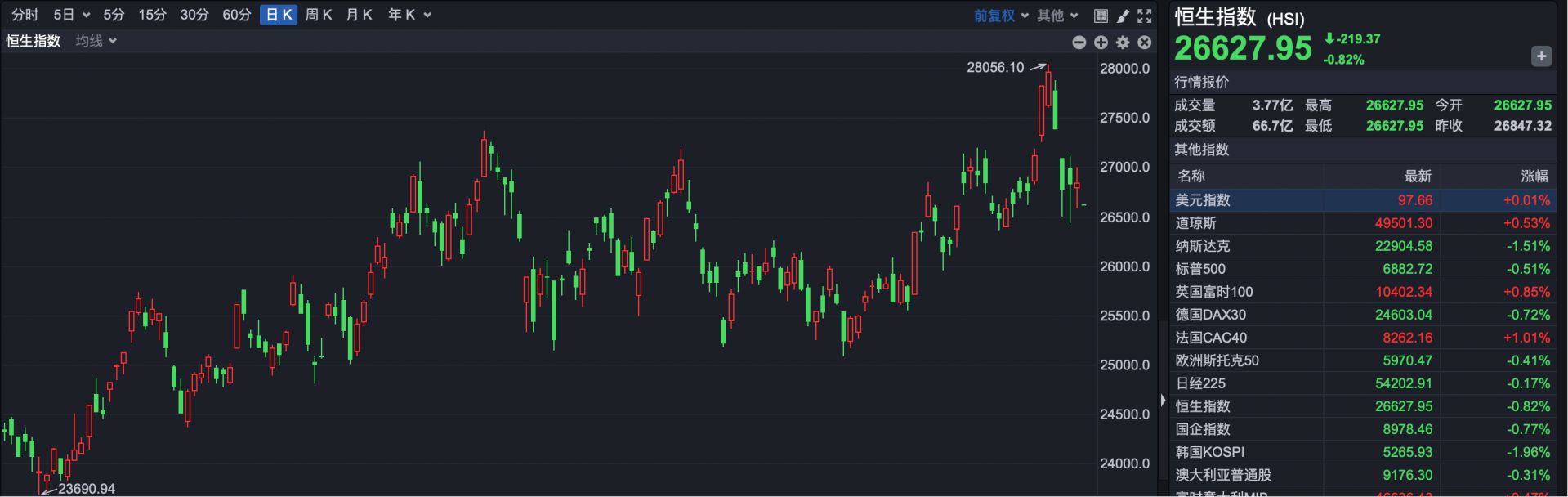 截至发稿,恒生指数开盘报26627.95点,下跌219.37点,跌幅0.82%。
