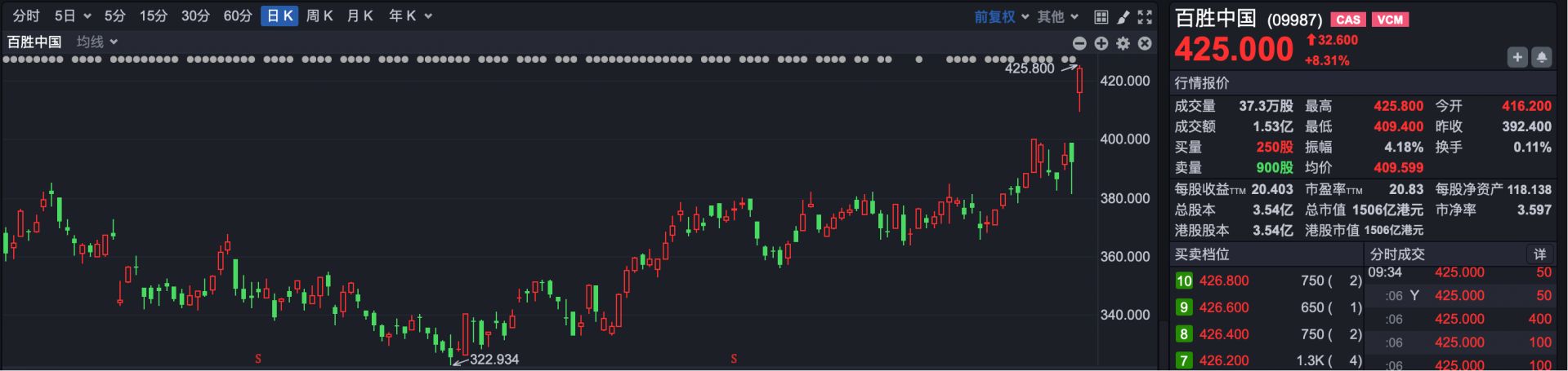 百胜中国(HK09987)公布2025年全年业绩,受强劲财报影响,今日早盘百胜中国高开超4%,截至发稿涨幅超过8%,创出2023年10月以来新高。