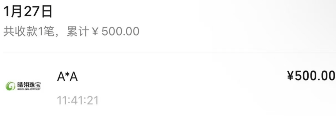 和杰我睿珠宝注册地一致的晴翎珠宝,也参与向前者用户付款。多名平台用户向第一财经提供的截图显示,杰我睿线上平台近期提现的数笔500元款项,来自于晴翎珠宝。