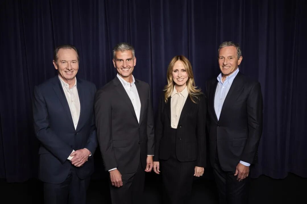从左到右:华特迪士尼公司董事会主席James Gorman、迪士尼体验业务主席戴明哲、迪士尼娱乐联合主席Dana Walden、迪士尼首席执行官罗伯特·艾格 图片来源:迪士尼中国公众号