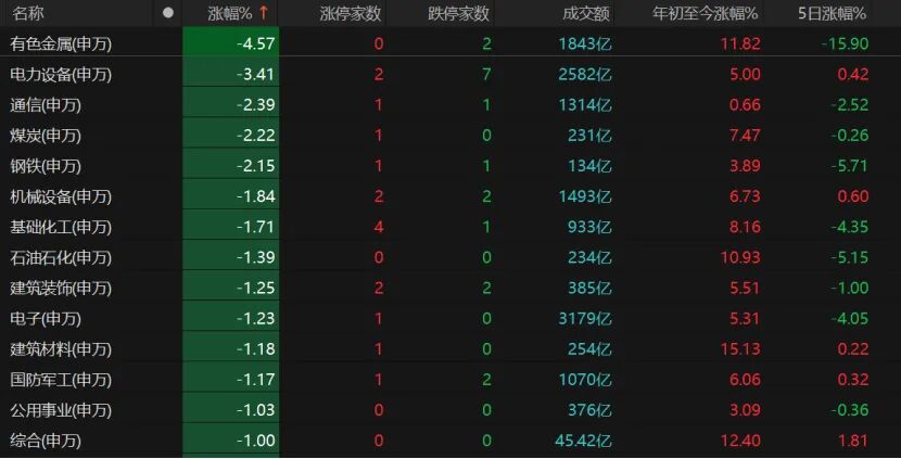有色金属、煤炭、钢铁、基础化工、石油石化等资源股熄火,电力设备、通信、机械设备等科技股也领跌。