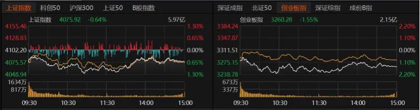 指数跌多涨少,沪指收跌0.64%报4075.92点,创业板指收跌1.55%报3260.28点,深证成指收跌1.44%。沪深300、上证50微跌,科创50跌逾1%,北证50跌逾2%。