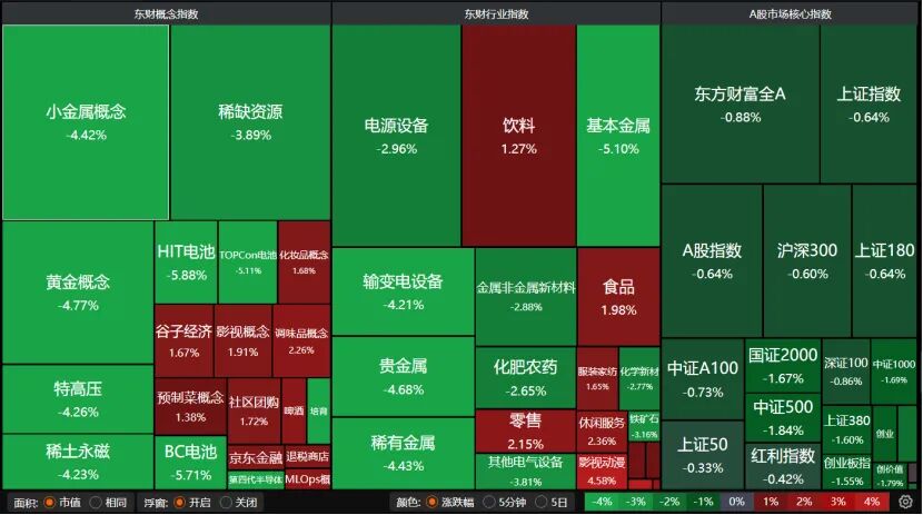盘面“绿肥红瘦”,小金属概念、稀缺资源、黄金概念、稀土永磁、HIT电池、输变电设备、电源设备、化肥农药均大跌,食品、零售、饮料等大消费表现不错。