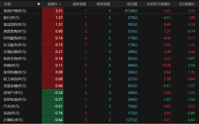 新旧大消费“抬头”,美容护理板块涨逾3%,食品饮料、商贸零售、纺织服饰逆市飘红,银行、券商股亦护盘。