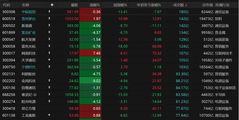 市场亏钱效应明显,3719只个股收跌,跌停股23只;1618只个股收涨,涨停股56只。随着交易量缩减,今日成交额超百亿元个股仅9只,多数热门股收跌,新易盛、紫金矿业跌幅均超4%,蓝色光标、天孚通信跌近6%。贵州茅台收涨1.97%报1555元/股,网宿科技涨逾7%报17.97元/股。