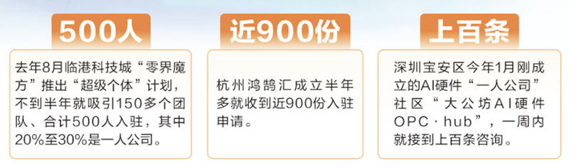 像“零界魔方”这样的OPC社区,正在全国悄然兴起。在杭州,鸿鹄汇成立半年多就收到近900份入驻申请,“经过筛选我们发出了30多份邀请,创业者里95后占50%至60%,00后也有25%左右。”王超说。深圳宝安区1月刚成立的AI硬件一人公司社区“大公坊AI硬件OPC・hub”,一周内就接到上百条咨询,吸引了中山、东莞、港澳、北京等各地创业者询问入驻事宜。