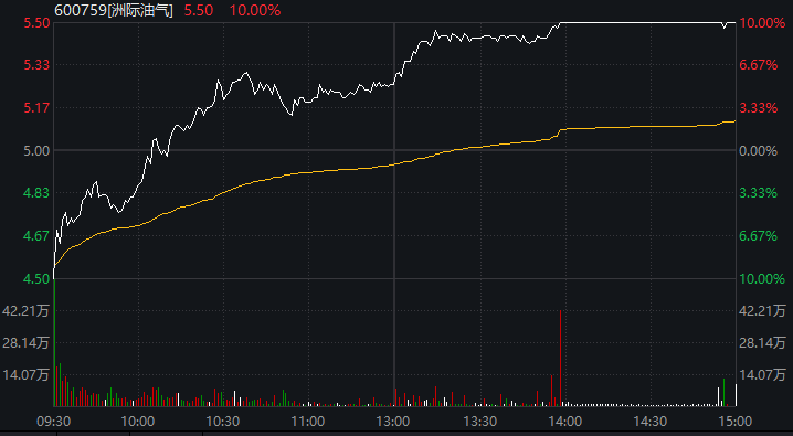 值得注意的是,洲际油气(600759)以跌停价开盘,随后震荡回升,尾盘涨停,上演“地天板”走势。