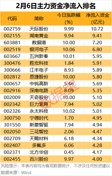 从个股看,40股主力资金净流入超2亿元,天际股份、湖南黄金、数据港、银河电子、五洲新春等13股获主力资金净流入超5亿元。