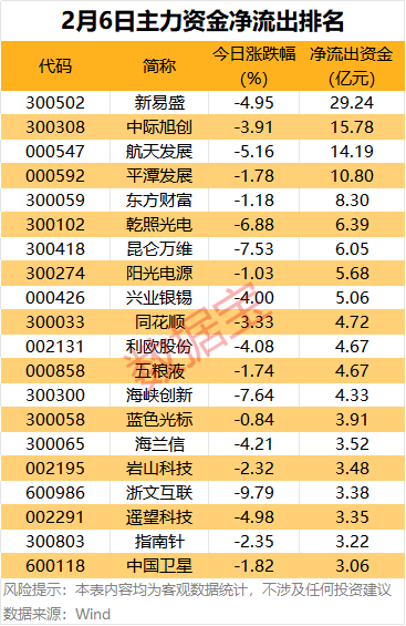 尾盘净流出方面,14股主力资金净流出超1亿元,新易盛、航天发展净流出居前,均超3亿元;中际旭创、网宿科技、利欧股份、深南电路净流出均超1亿元。