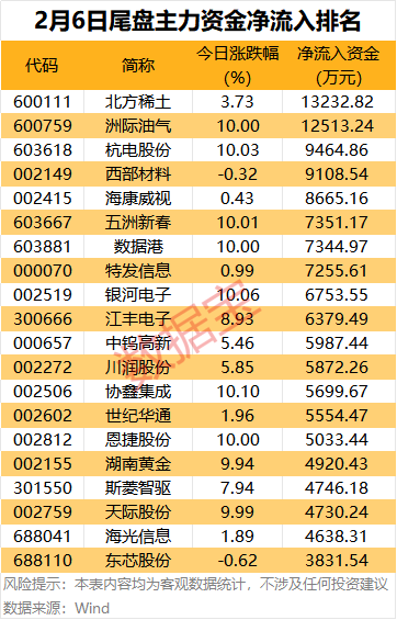 个股方面,北方稀土、洲际油气尾盘主力资金净流入均超1亿元,杭电股份、西部材料、海康威视、五洲新春尾盘净流入均超7000万元。