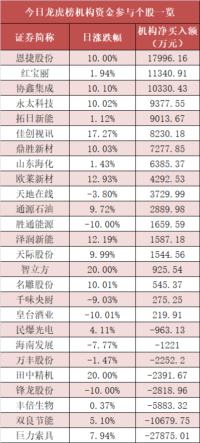 盘后龙虎榜数据显示,当天机构现身多股,其中恩捷股份等股票呈现机构资金净买入,巨力索具等股票呈现机构资金净卖出。