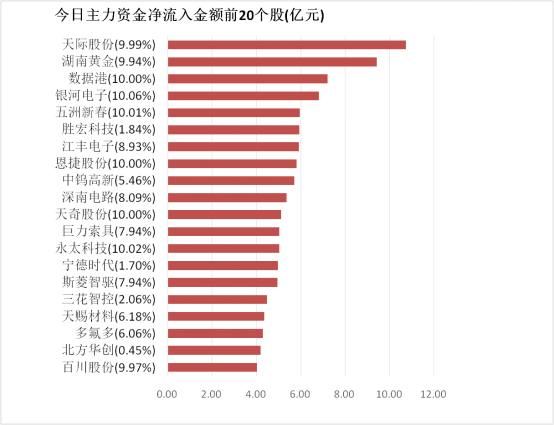 4.天际股份主力资金净流入10.72亿元居首