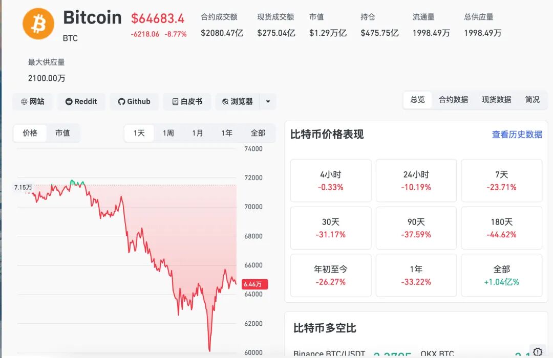 比特币在2月1日(北京时间,下同)跌破8万美元关口,2月5日跌破7万美元大关,2月6日早间一度下探至6万美元关口,截至当日12时35分,比特币报6.47万美元,24小时跌幅为10.19%,过去30天跌幅达31.17%。