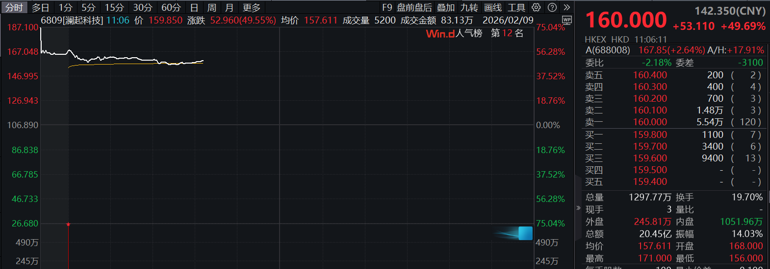 澜起科技开盘价为168港元,较发行价上涨57.1%;截至目前,仍大涨近50%,公司市值超过1900亿港元。