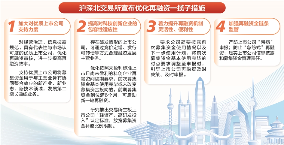 2月9日,沪深北交易所宣布优化再融资一揽子措施。本次一揽子优化举措中,沪深北交易所聚焦影响再融资功能充分发挥、各方反映集中的突出问题,优化再融资机制安排,打通卡点堵点,进一步提高再融资效率;坚持扶优限劣、支持科技创新原则,加大对优质上市公司再融资的支持力度,引导资源向新质生产力领域集聚;坚持把防风险、强监管摆在突出位置,既要“放得活”又要“管得好”,着力构建活而有序的市场秩序;坚持稳中求进,区分不同情形,稳步有序推进,成熟一项、推出一项。