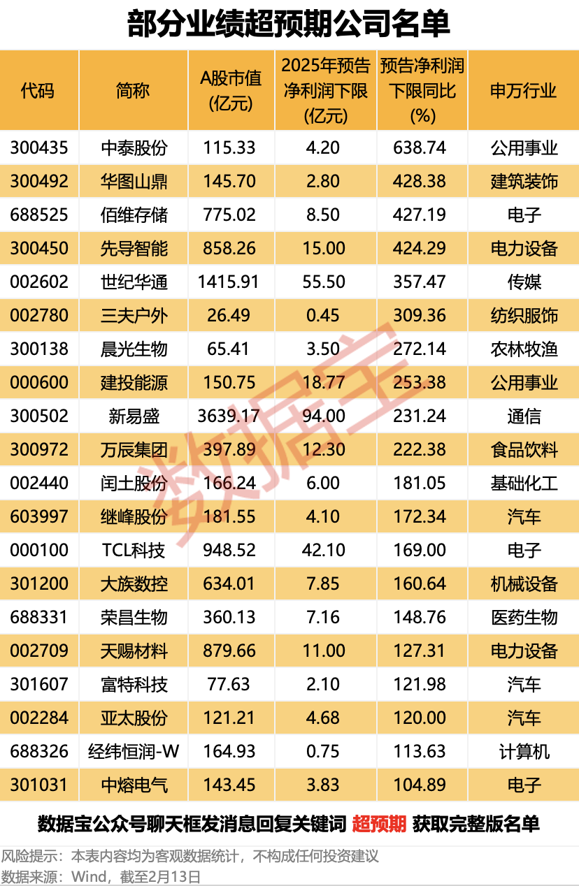 春节前后,A股市场进入2025年年报业绩预告、快报的披露高峰期,部分上市公司通过一系列改革措施,经营效率大幅提升,同时受益于产品供需格局优化、行业景气度提升以及资产处置等影响,实现了业绩的超预期增长。