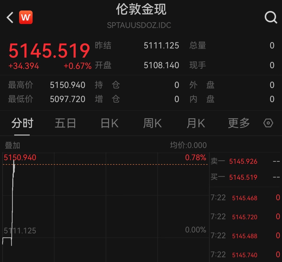 2月23日,黄金、白银开盘直线拉涨。截至发稿,国际现货黄金涨幅为0.67%,报5145.519美元/盎司;现货白银突破86美元/盎司,日内涨幅扩大至2%。