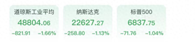 周一,美股低开低走,软件与金融板块领跌。上周五美国最高法院裁定特朗普政府对进口商品征收的全面关税违宪后,白宫随即发出新一轮贸易威胁,市场再度陷入关税政策的迷雾。截至收盘,道指跌821.91点,跌幅1.66%,报48804.06点,纳指跌1.13%,报22627.27点,标普500指数跌1.04%,报6837.75点。衡量市场波动性的芝商所恐慌指数VIX大涨11.05%,报21.20。