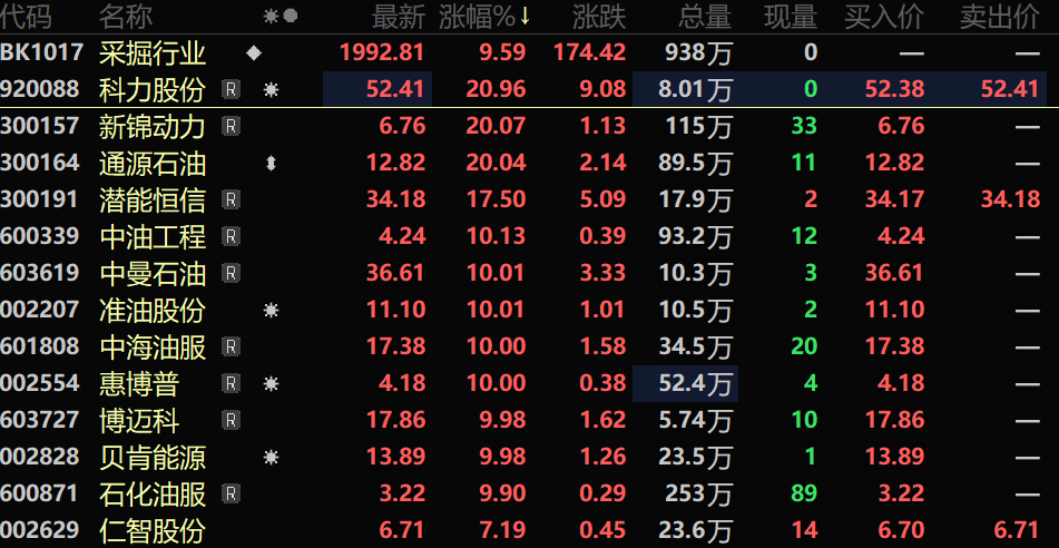 盘面上,油气开采及服务板块高开后大幅拉升,板块内,半数个股涨停,通源石油“20cm”涨停,中油工程、准油股份、中曼石油等多股涨停。