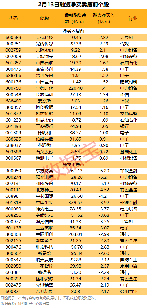 具体到个股,2月13日共有677只股获融资净买入,净买入金额在千万元以上的有163只,其中15只融资净买入额超亿元。大位科技融资净买入额居首,当日净买入2.82亿元,其次是光线传媒、天际股份,融资净买入金额分别为2.49亿元、2.11亿元,融资净买入金额居前的还有大族激光、中国石油、香农芯创等。