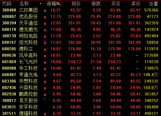 CPO概念盘中走势强劲,截至收盘,天孚通信涨近13%,盘中涨超15%续创历史新高;炬光科技涨超10%突破400元大关,亦创历史新高;长飞光纤涨停亦创出新高,华工科技强势涨停。
