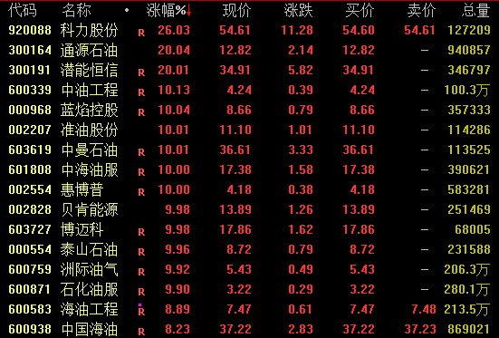 石油板块盘中大幅走高,截至收盘,科力股份涨约26%,通源石油、潜能恒信20%涨停,准油股份、中曼石油、中海油服等亦涨停,中国海油涨超8%,中国石油等涨超5%。