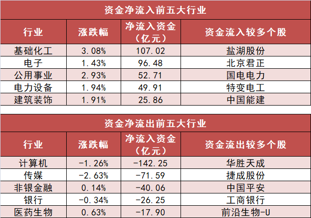 申万一级行业中,17个行业实现资金净流入,其中基础化工行业净流入107.02亿元居首。