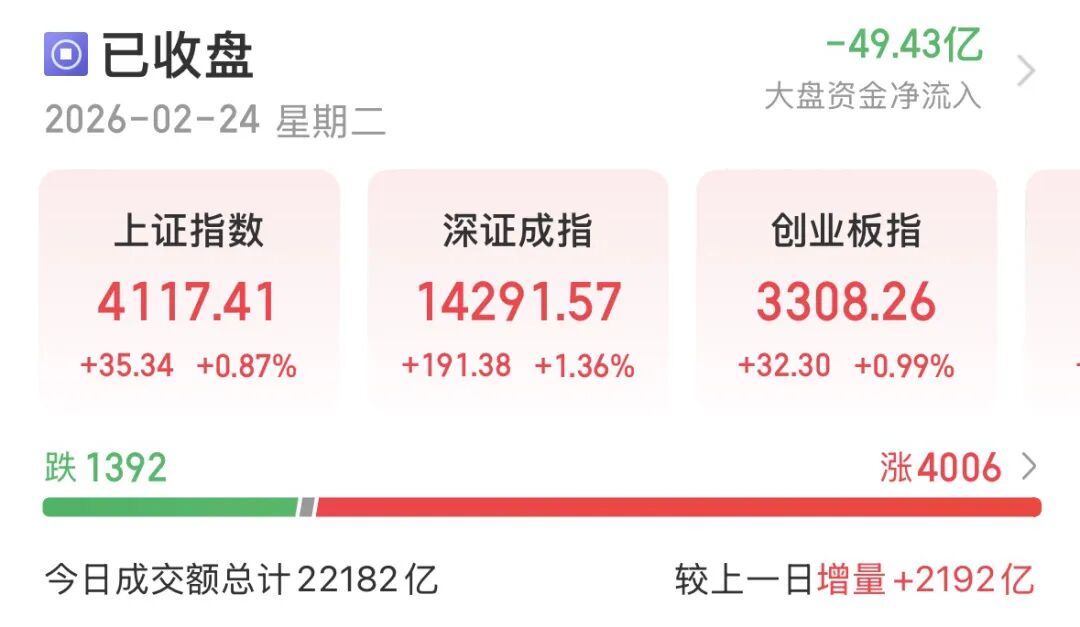 2月24日,A股迎来马年首个交易日,市场呈现“开门红”态势。全天成交额放量至2.22万亿元,超过4000只个股上涨,市场氛围积极。板块方面,石油石化、化工、有色、煤炭等资源股集体领涨,而传媒与大消费板块相对疲软。