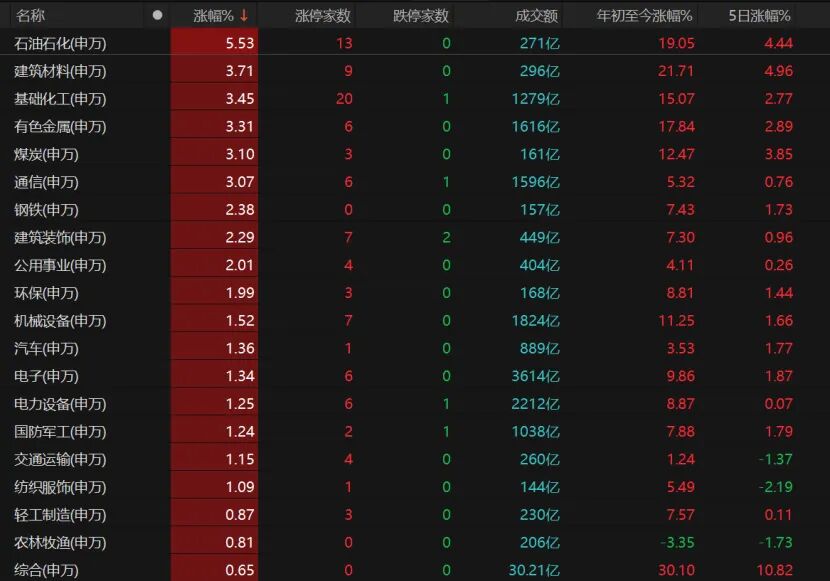 24个板块收红,石油石化涨幅超过5%,建筑材料、基础化工、有色金属、煤炭等涨幅超过3%。