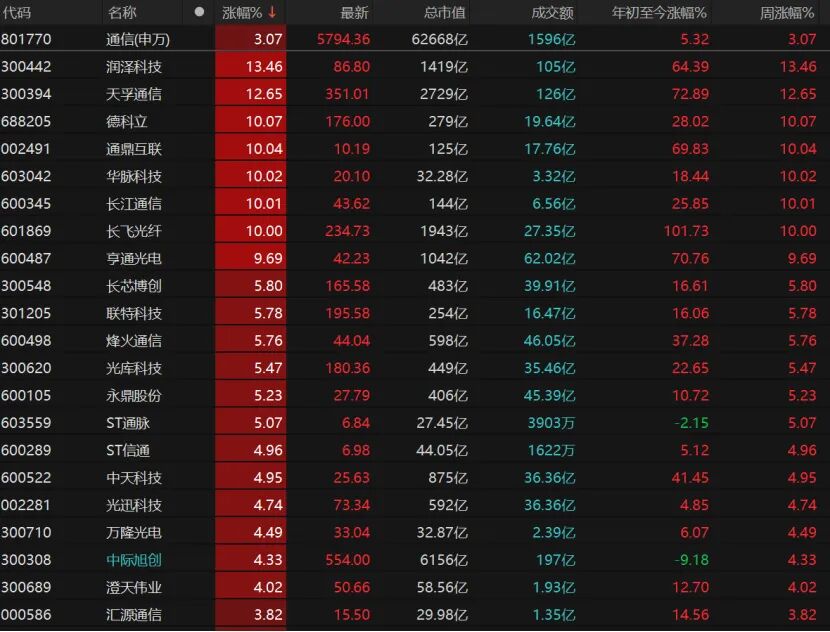 6只通信股涨停,通鼎互联、华脉科技、长江通信、长飞光纤涨停。