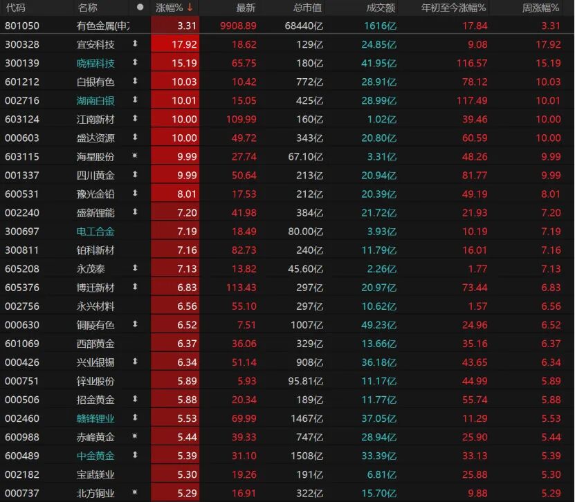6只有色金属个股涨停,宜安科技、晓程科技大涨,白银有色、湖南白银、江南新材、盛达资源等个股涨停。