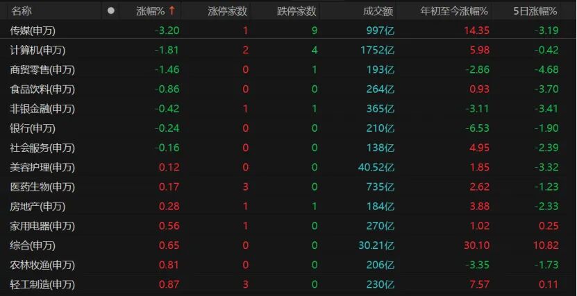 31个申万一级行业中,传媒板块跌幅超过3%,计算机、商贸零售、食品饮料也收跌。