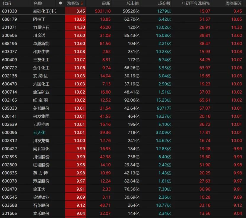 20只化工股涨停,阿拉丁、力量钻石、川金诺均大涨,和邦生物、三友化工、金牛化工、安纳达、六国化工等个股均涨停。