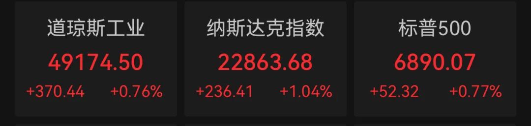 道琼斯工业指数上涨370.44点,涨幅0.76%,收于49174.50点;标普500指数上涨52.32点,涨幅0.77%,收于6890.07点;纳斯达克综合指数上涨236.41点,涨幅1.05%,收于22863.68点。