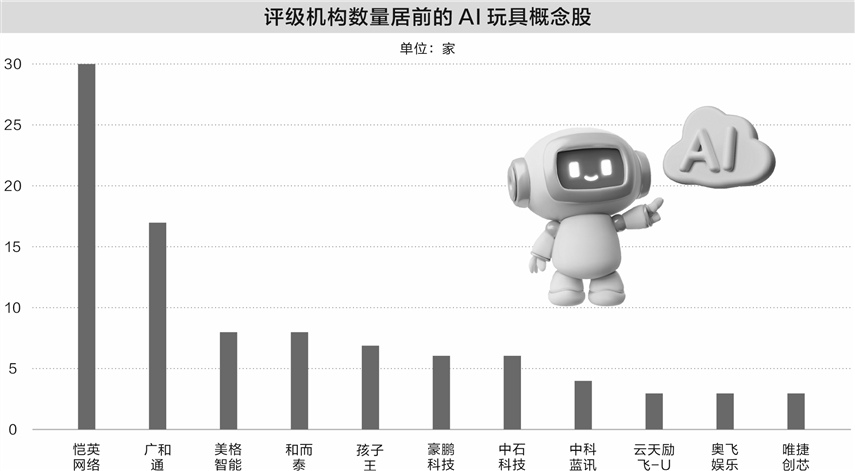 机构关注度方面,机构给予“积极型”评级(含买入、增持、强烈推荐等)的AI玩具概念股有18只。恺英网络、广和通、美格智能、和而泰、孩子王等获评级机构数量靠前。