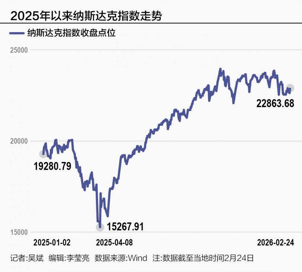 AI热潮已经逐渐回归理性。截至美国东部时间2月24日收盘,纳斯达克指数年内下跌1.63%,这与过去三年连续大涨逾20%形成了鲜明对比。