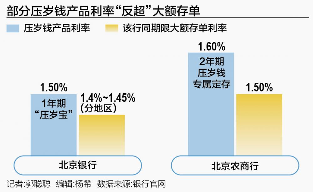 城商行正推出多项定制产品。杭州银行推出签约亲情账户专属的定期存款,三年期存款利率达1.9%,起购金额1000元。北京银行推出的“小京压岁宝”产品面向“小京卡”客户,提供三档选择:一年期1.5%、两年期1.6%、三年期1.75%,均为1000元起存。