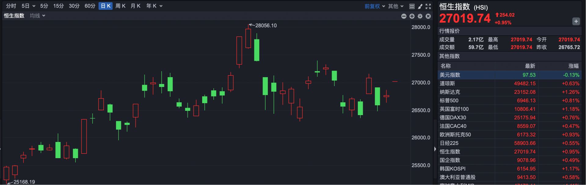 截至发稿,恒生指数开盘报27019.74点,上涨254.02点,涨幅0.95%。