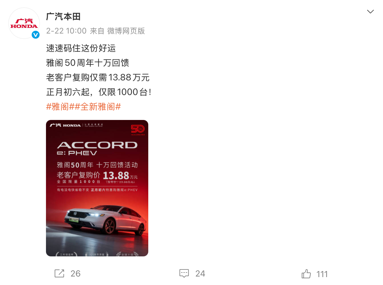 近日,广汽本田旗下的明星车型雅阁开启大幅降价的活动引发关注。广汽本田此前宣布,为庆祝雅阁50周年,老客户复购雅阁e:PHEV直降10万元,仅需13.88万元。虽创下上市后最高降价纪录,但仅限量1000辆。