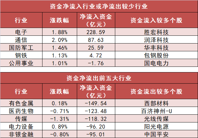 申万一级行业中,4个行业实现资金净流入,其中电子行业净流入228.59亿元居首。