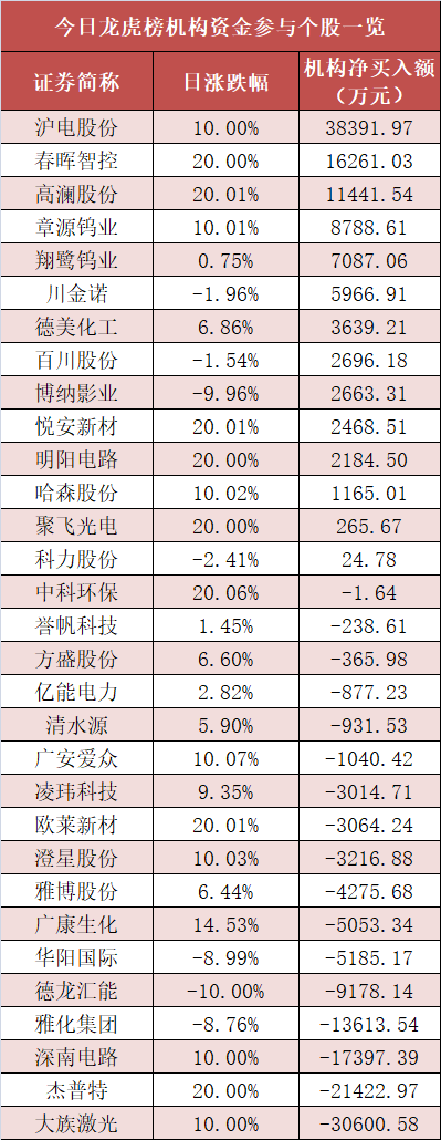 盘后龙虎榜数据显示,机构现身多股,其中沪电股份等股票呈现机构资金净买入,大族激光等股票呈现机构资金净卖出。