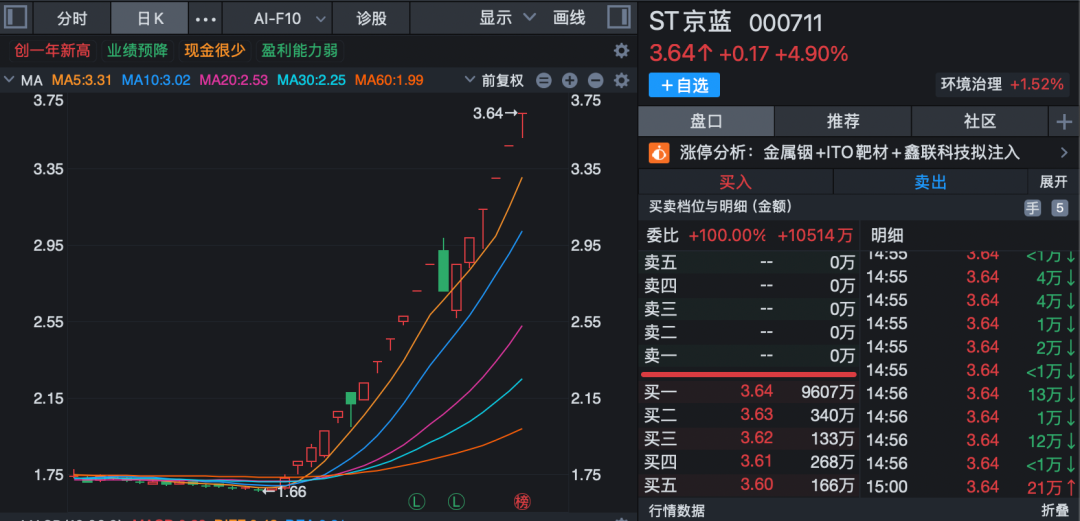 2月26日,ST京蓝(000711)再度涨停,股价升至3.64元/股,市值约为104亿元。从1月26日至今的短短一个月内,ST京蓝股价涨超110%,其间多个交易日涨停。