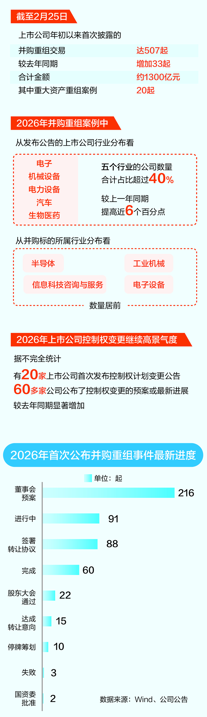 在政策和市场的合力驱动下,2026年初并购重组活跃度继续提升,呈现出量质齐升的特点。万得数据显示,今年截至2月25日,上市公司首次披露的并购重组交易507起,较去年同期增加33起;其中360起交易披露了金额,合计约1300亿元,平均每起交易金额3.6亿元。交易总规模超过10亿元以上的约30起,近2/3的交易规模不超过1亿元。已公布的交易中,有20起为重大资产重组。