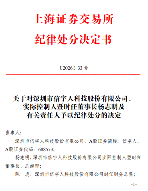 2月27日,上交所发布关于对深圳市信宇人科技股份有限公司(以下简称公司或信宇人 证券代码:688573)、实际控制人暨时任董事长杨志明及有关责任人予以纪律处分的决定。