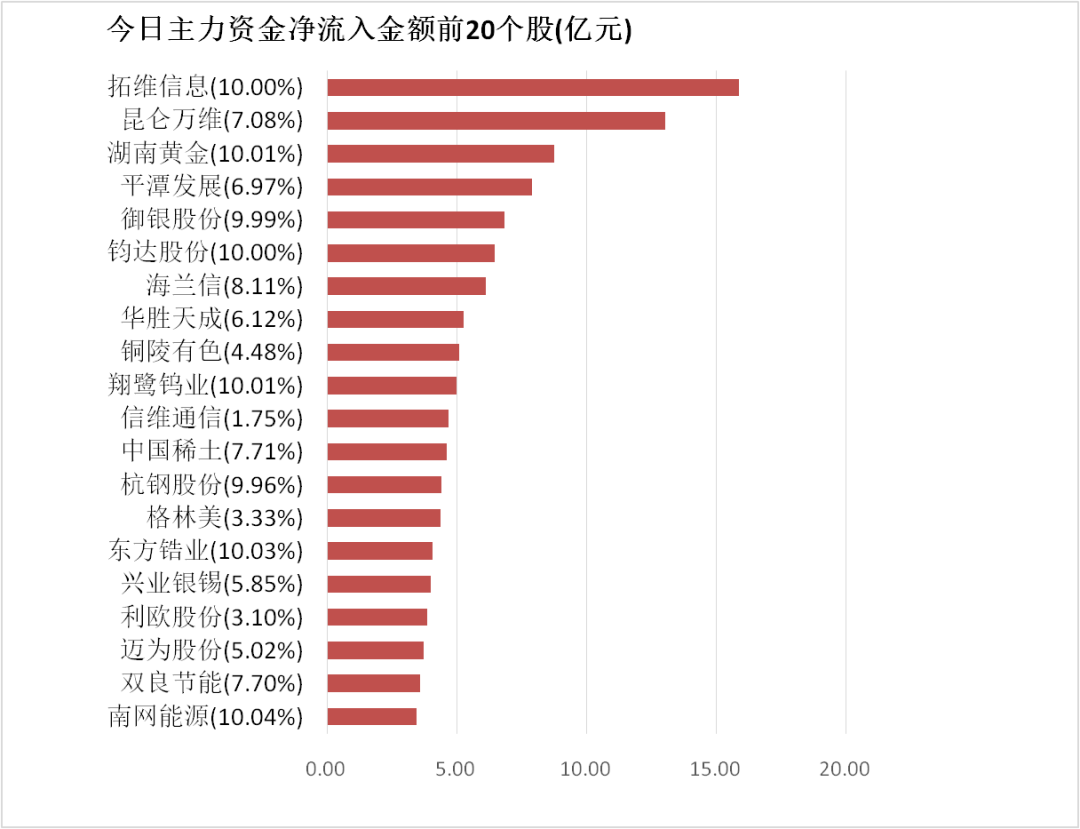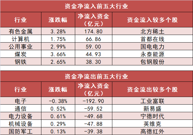 申万一级行业中,15个行业实现资金净流入,其中有色金属行业净流入174.8亿元居首。