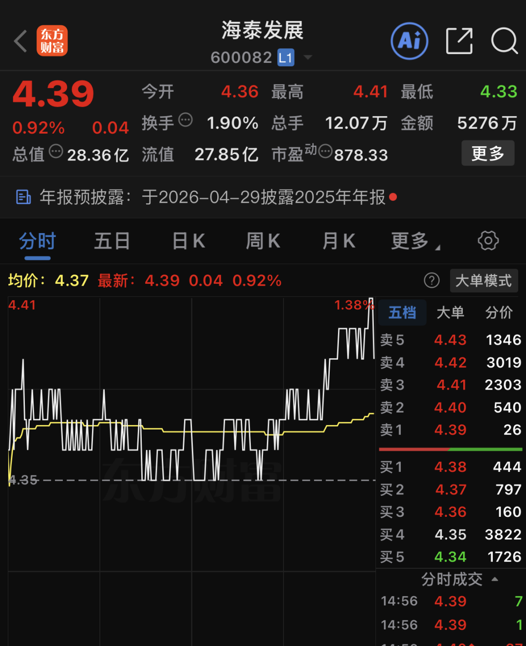 股价方面,海泰发展最新报4.39元/股,最新市值超28亿元。
