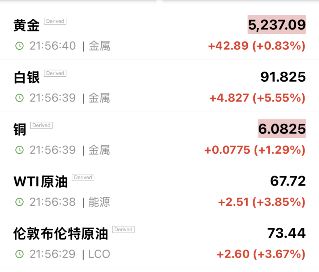 金银油全线拉升。截至发稿,白银大涨5.55%,报91.825美元/盎司。沪银期货主力合约涨6.85%,报23905元/千克;沪金期货主力合约涨1.39%,报1160元/克。黄金涨0.83%。