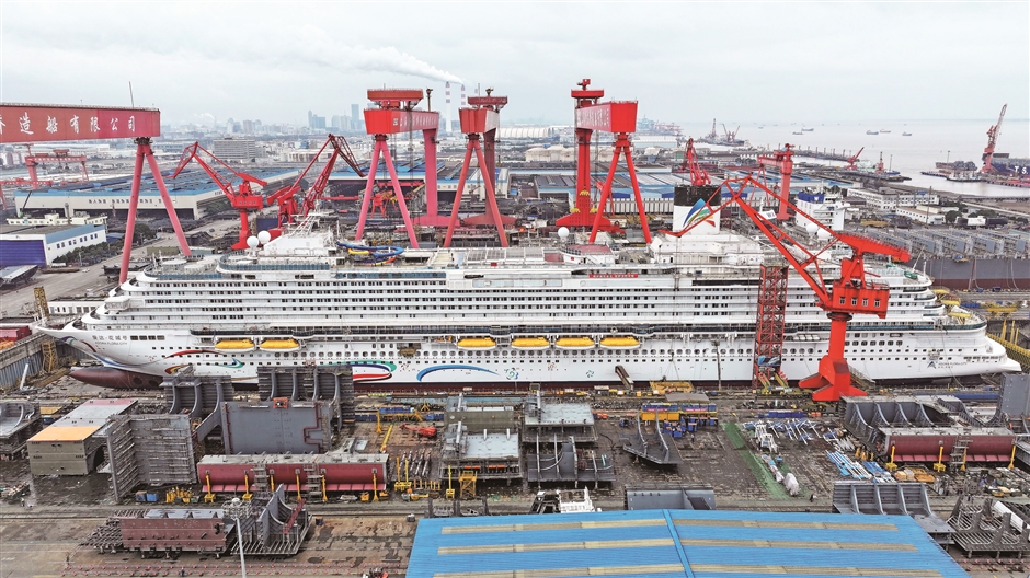 2月27日,记者从上海外高桥造船有限公司了解到,中国第二艘国产大型邮轮“爱达·花城号”主体建造已基本完成,计划于3月中旬出坞,转入码头系泊调试新阶段。根据计划,“爱达·花城号”邮轮将于2026年5月底出海试航,预计年底前正式交付。 中新社记者 殷立勤/摄