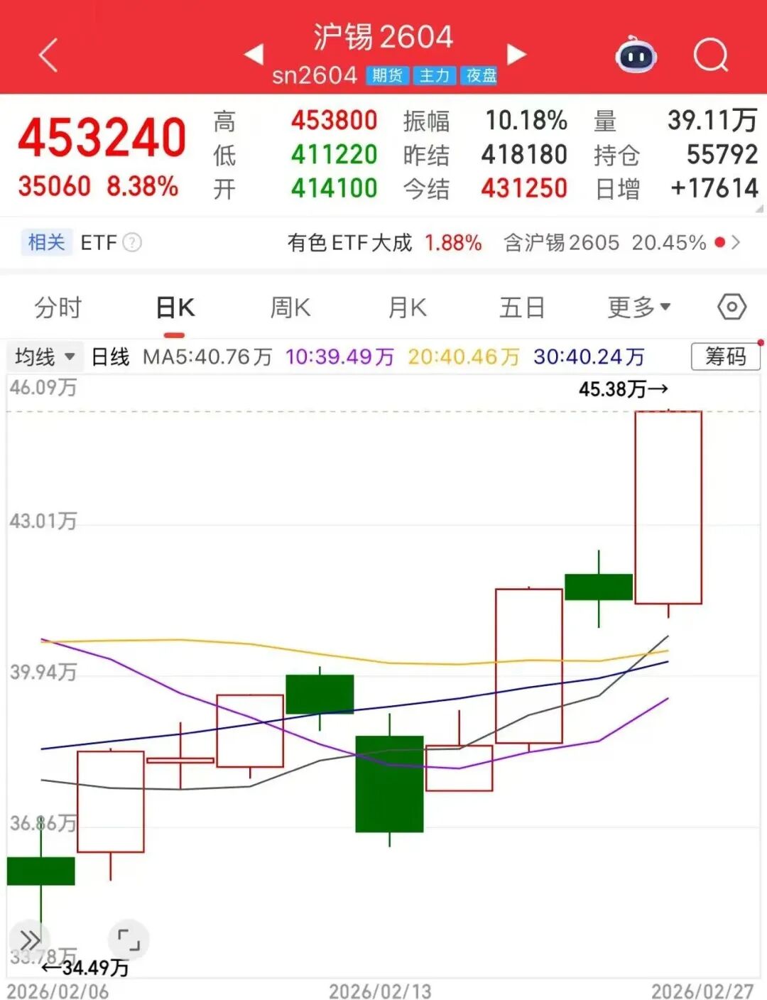 春节假期后,沪锡期货主力合约录得“四连阳”,周五截至收盘上涨8.38%,突破45万元/吨大关,本周累计上涨19.19%。