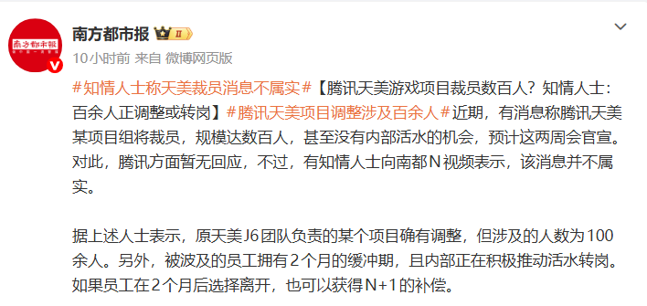 据上述人士表示,原天美J6团队负责的某个项目确有调整,但涉及的人数为100余人。另外,被波及的员工拥有2个月的缓冲期,且内部正在积极推动活水转岗。如果员工在2个月后选择离开,也可以获得N+1的补偿。